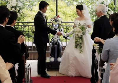 這款高約1.5米的機(jī)器人身體主要是白色,頭戴花環(huán),還有兩根塑料辮子!八钡难劬梢蚤W爍,也可以用她細(xì)細(xì)的嗓音說出“你可以揭開新娘的面紗了”之類的話語,主持起婚禮是有模有樣。