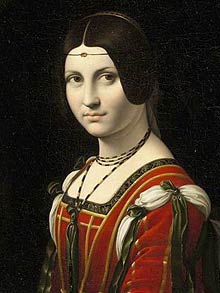 喬治接著解釋道,歷史上曾有兩幅文藝復(fù)興時(shí)期的肖像被冠名以《La belle ferronnière》之名。第一幅就是現(xiàn)在看到的這幅,它有時(shí)也被稱作《不知名婦女的肖像》,畫中人有可能是盧克雷齊亞·克里韋利,是米蘭公爵盧多維科·斯福扎的一個(gè)情婦,曾收藏此畫的盧浮宮將此畫歸為達(dá)芬奇畫派的作品,認(rèn)為它可能出自達(dá)芬奇之手也可能是由達(dá)芬奇的某一名學(xué)生所畫。另一幅肖像畫畫的是切奇莉亞·加勒蘭妮,她是盧多維科的另一個(gè)情婦,那幅畫幾乎可以確定就是達(dá)芬奇的作品,它也常被稱作《抱貂的女士》。