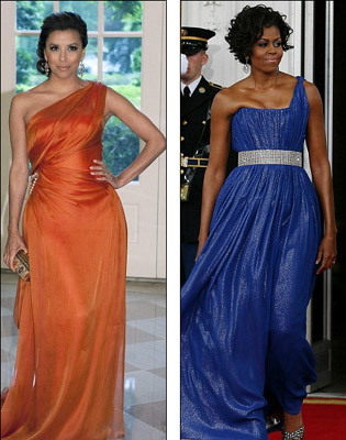 中新網(wǎng)5月20日電 據(jù)外媒報(bào)道,美國白宮19日舉辦國宴,款待墨西哥總統(tǒng)卡爾德龍夫婦。此間美國第一夫人的穿衣打扮再被媒體拿出來品頭論足。不幸的是,這次米歇爾•奧巴馬竟然與“絕望主婦”伊娃•朗格利亞大撞衫,頗為尷尬!