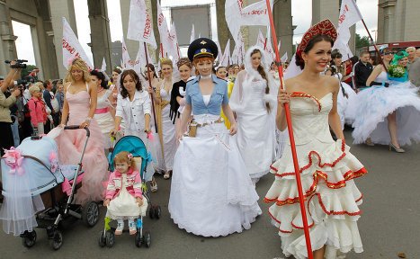 中新網(wǎng)6月2日電 據(jù)俄羅斯媒體報(bào)道,200多位身著風(fēng)格迥異婚紗的俄羅斯美女2日齊聚莫斯科街頭,參加一年一度的“新娘”大游行。