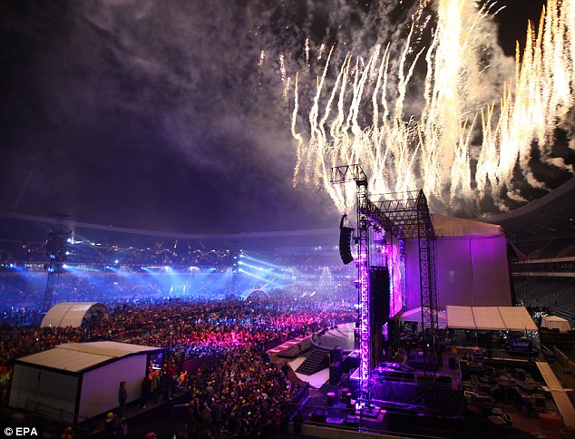 演唱會由傳統(tǒng)的非洲舞曲拉開序幕。之后美國樂隊(duì)黑眼豆豆一襲角斗士扮相登上舞臺,為觀眾送上三首經(jīng)典曲目,引爆全場熱情。