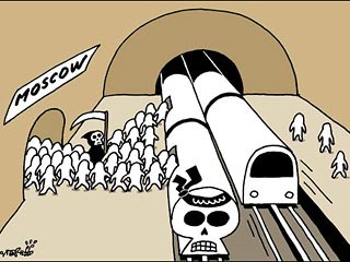 這篇題為“莫斯科地鐵襲擊”的漫畫(huà)發(fā)表在“觀點(diǎn)(Opinion)”欄目?jī)?nèi)。漫畫(huà)將地鐵車(chē)頭被畫(huà)成“骷髏頭”,額頭還綁著類(lèi)似阿拉伯文的黑布。急著上地鐵的乘客被畫(huà)成白色,人彈被畫(huà)成手拿鐮刀的黑色死神。