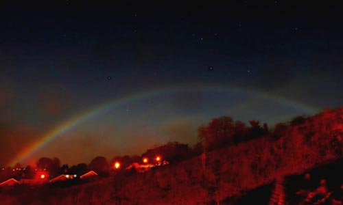 據(jù)報道,彩虹出現(xiàn)在英國北約克郡Richmond鄉(xiāng)村地區(qū),通常彩虹是雨滴折射陽光形成的景象,而此次彩虹出現(xiàn)時太陽已經(jīng)下山很久了,不過當天有一輪圓月,為人們帶來了奇特的夜間彩虹。