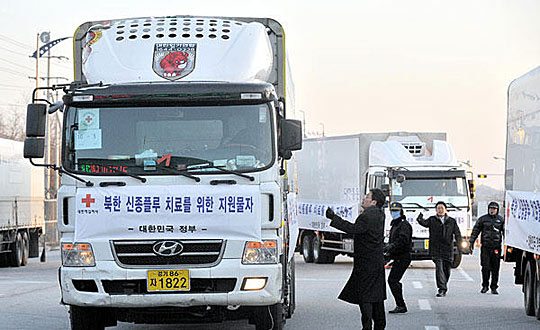 韓國(guó)支援團(tuán)當(dāng)天上午10點(diǎn)左右同朝方人員會(huì)面,利用1小時(shí)30分鐘左右的時(shí)間將50萬(wàn)人份甲流感治療藥物轉(zhuǎn)載在朝方的車輛上。此前,韓國(guó)政府從朝韓合作基金中劃撥178億韓元,用于購(gòu)買治療甲流的藥物。