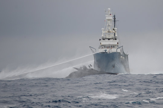 據(jù)英國廣播公司報(bào)道,名為阿迪·基勒的快艇在事件中嚴(yán)重受損,但是艇上的六個人獲救!昂I夏琳摺钡陌l(fā)言人說,日本捕鯨船的做法已經(jīng)使得彼此間的沖突變成“真正的鯨魚大戰(zhàn)”。