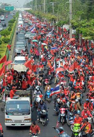 第一波示威活動(dòng)于12日傍晚結(jié)束。紅衫軍13日將重新集結(jié),前往皇家田廣場等主要集會(huì)場所,附近是熱門旅游景點(diǎn)大皇宮及玉佛寺。東北部和北部各省的上萬紅衫軍支持者昨天也開始向曼谷出發(fā),將于周日抵達(dá)。