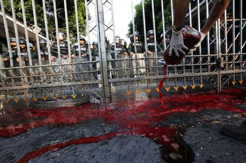 防暴警察讓部分紅衫軍代表提著數(shù)桶鮮血進(jìn)入鐵閘。他們在眾人的歡呼聲中,穿過鐵甲威龍般的軍警隊(duì)列,行至總理府正面的鐵門前。在媒體的鏡頭前,紅衫軍代表們將鮮血傾倒在那里。