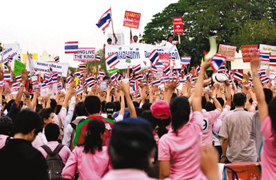 這批“粉衫軍”包括來(lái)自曼谷朱拉隆功大學(xué)的師生、旅游業(yè)者和“和平網(wǎng)絡(luò)”組織的成員,有人稱(chēng)他們?yōu)椤胺奂t運(yùn)動(dòng)”。在前副警察總長(zhǎng)瓦西和朱拉隆功大學(xué)政治科學(xué)系主任乍叻帶領(lǐng)下,他們昨日在倫披尼公園內(nèi)的拉瑪四世像前宣誓,矢言保護(hù)國(guó)家,同時(shí)聯(lián)署請(qǐng)?jiān)感牛磳?duì)解散國(guó)會(huì)和修改憲法,指此舉不符合國(guó)家最佳利益。
