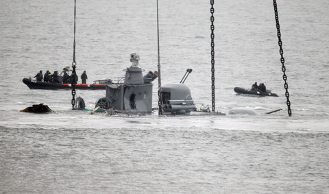 中新網(wǎng)4月13日電 據(jù)韓國(guó)《朝鮮日?qǐng)?bào)》報(bào)道,4月12日下午,天安艦沉沒(méi)后的第17天,艦尾終于被吊出水面。海軍方面將艦尾移動(dòng)4.6公里,移往白翎島沿岸水深較淺的海域。