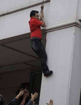 紅衫軍領(lǐng)導(dǎo)人阿里斯曼(Arisman Pongruanrong)通過(guò)繩梯從位于曼谷市中心的這家酒店爬下,在等候的紅衫軍民眾的幫助下,進(jìn)入一輛車中然后迅速離開。另外一名紅衫軍領(lǐng)導(dǎo)人從酒店窗戶爬出并順著一棵樹滑下,也成功逃離現(xiàn)場(chǎng)。