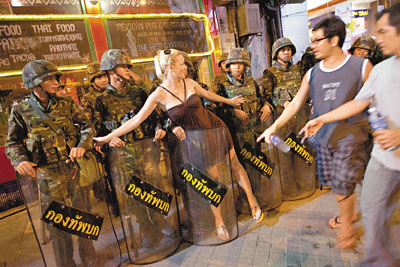 泰國軍警日前全副武裝進駐金融區(qū)進行布防。軍方警告,如果反政府紅衫軍闖入“曼谷華爾街”,當局會毫不猶豫采用武力驅(qū)散示威者后,并允許士兵在自衛(wèi)時發(fā)射實彈。