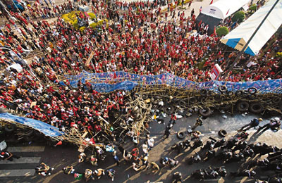 榴彈襲擊翌日,數(shù)百名防暴警察手持盾牌警棍,沒有攜帶槍械,向購物區(qū)的紅衫軍集結(jié)點推進。紅衫軍用尖竹和車胎堆成3米高的路障,并灑上汽油,迫使警方退后。紅衫軍后來答應警方要求,后退100米,但并未拆除路障。