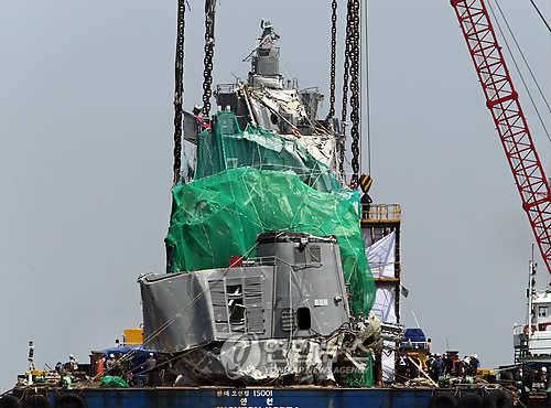 被吊至駁船上,在進(jìn)行固定之后,韓國海難救援隊(duì)(SSU)將進(jìn)入艦艇內(nèi),進(jìn)行遺體找尋工作。與此同時(shí),軍民聯(lián)合組成的調(diào)查團(tuán)將開展事故原因的調(diào)查工作。