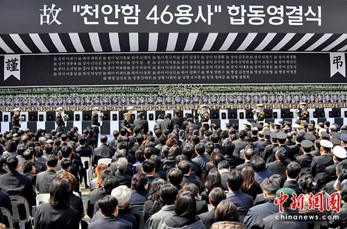 中新網(wǎng)4月29日電 據(jù)韓聯(lián)社報道,在爆炸沉沒事件中遇難的韓國警戒艦天安艦46名官兵的遺體告別儀式29日上午在韓國海軍平澤第二艦隊司令部內安保公園舉行。