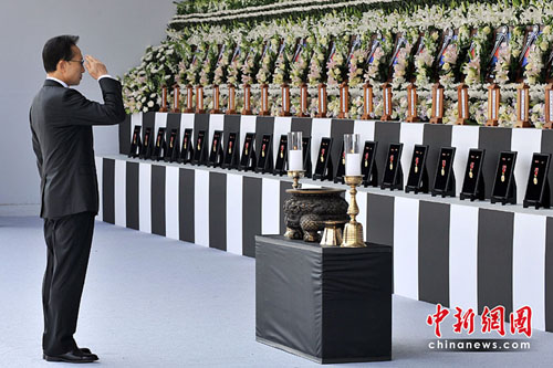 李明博和遺屬代表向46名犧牲勇士獻花、焚香。之后,鳴放9響禮炮,艦艇鳴響10秒的汽笛。