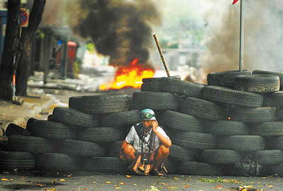 13日,為了逼迫占據(jù)曼谷繁華商業(yè)區(qū)已近兩個(gè)月的“紅衫軍”撤離,泰國(guó)政府切斷了該商業(yè)區(qū)的水電供應(yīng),“紅衫軍”隨即與軍警發(fā)生沖突。16日,“紅衫軍”點(diǎn)燃了作為路障的汽車(chē)輪胎,一股股濃煙騰空而起。此外,他們還把警察設(shè)立的交通檢查站潑上汽油并放火焚燒。