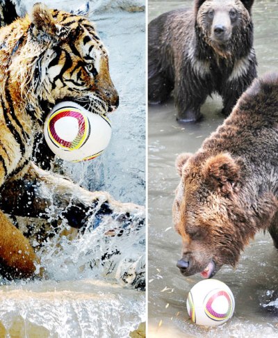 中新網(wǎng)6月10日電 據(jù)韓國《中央日?qǐng)?bào)》網(wǎng)站報(bào)道,2010年南非世界杯開賽在即,動(dòng)物們也喜歡世界杯,加入了如炎熱的天氣般熾熱的世界杯浪潮。在韓國,動(dòng)物園內(nèi)的老虎和熊在水中興致勃勃地玩起了足球。