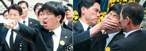 韓國去年5月29日為盧武鉉舉行葬禮。遺體告別儀式上,當(dāng)李明博起身準(zhǔn)備向盧武鉉遺像獻(xiàn)花時(shí),白元宇突然朝他大喊“你是政治殺人犯”“請李總統(tǒng)道歉”。