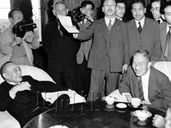 1946年,鳩山一郎在政權(quán)唾手可得之際,被盟軍總司令部以戰(zhàn)爭期間曾與軍部合作為由開除公職,吉田茂取而代之做了首相;謴(fù)公職后,鳩山成為逼迫吉田內(nèi)閣交權(quán)的競爭對(duì)手。為和致力于日美外交的吉田相抗衡,1954年鳩山就任首相后以自身政治生命為賭注,于1956年實(shí)現(xiàn)了日蘇邦交正;,此事此廣為人知。