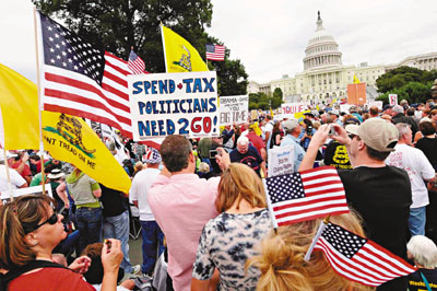 示威者逼爆賓夕法尼亞大道,連綿數(shù)個街區(qū),齊向國會山莊浩浩蕩蕩前進(jìn)。他們高舉奧巴馬和美國眾議院議長佩洛西的肖像,以及寫滿“不要更多的開支,不要更多的稅收,不要更多的謊言”、“支持奧巴馬的醫(yī)療改革方案等于自殺”等各種各樣的標(biāo)語。