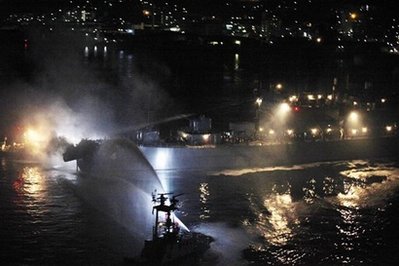 綜合此間報道,事發(fā)現場位于連接福岡縣北九州市與山口縣下關市兩市的關門橋正西約一公里的海面。兩船相撞后,KURAMA號的船頭和“CARINA STAR”號的集裝箱同時起火,火勢在半個多小時后得到控制,至少有三名自衛(wèi)隊成員在救火過程中受傷。