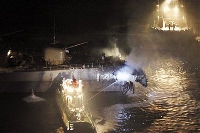 一九八一年開始服役的KURAMA號,隸屬日本海上自衛(wèi)隊第二艦群,全長一百五十九米,寬十七點五米,排水量五千二百噸,最大時速三十一海里,搭乘三架反潛直升機。在剛剛于十月二十五日結束的日本海上自衛(wèi)隊觀艦式(相當于海軍閱兵式)上,該船作為“觀閱艦”為日本副首相菅直人的搭乘艦。事發(fā)時,KURAMA號正處于結束觀艦式后返回佐世保基地的途中。艦上載有一百五、六十名自衛(wèi)隊隊員。而與其相撞的韓國集裝箱船“CARINA STAR”號全長一百二十七米,寬二十米,事發(fā)時正處于自韓國釜山前往日本大阪的途中。