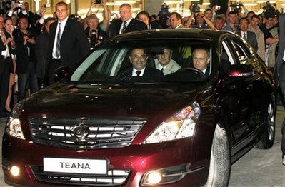 中新網(wǎng)6月3日電 日本日產(chǎn)公司在圣彼得堡設(shè)立的新工廠向參加工廠開(kāi)幕式的來(lái)賓展示了該廠生產(chǎn)的日產(chǎn)天籟(Nissan Teana)車。俄羅斯總理普京2日坐到這輛車的駕駛員位置上,開(kāi)車帶該廠廠長(zhǎng)兜了一圈。