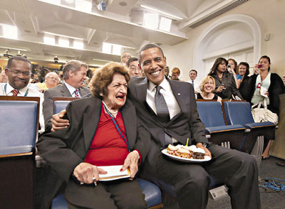8月4日是奧巴馬48歲生日,也是赫斯特報(bào)系專欄作家湯馬斯的89歲生日。白宮首席發(fā)言人吉布斯在白宮新聞發(fā)布室內(nèi)進(jìn)行每日簡報(bào),大批記者聚集向他提問,此時(shí),奧巴馬捧杯形蛋糕入內(nèi),帶領(lǐng)記者團(tuán)為湯馬斯唱生日歌。