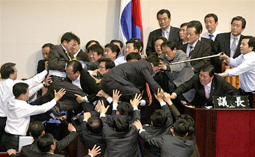 韓國國會議員2007年12月14日因一項彈劾檢察官的提案而發(fā)生大規(guī)模群毆,這些檢察官為呼聲最高的總統(tǒng)候選人李明博清除了詐欺罪嫌。據(jù)“中央社”報道,在大約100名在野黨籍議員以桌椅阻擋國會主要議事廳的出入口后,一群親政府的議員被迫穿越圍欄以設法進入議事廳。 chinanews發(fā) 攝