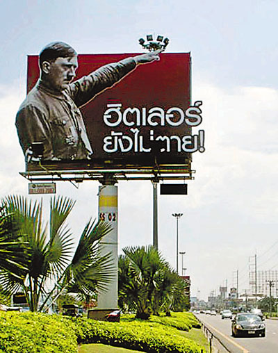 據(jù)悉,希特勒廣告牌于兩周前豎起,是為當?shù)芈芬讏D索蠟像館下月開張做的宣傳。該廣告牌位于進入芭堤雅的主要高速路旁,希特勒的畫像與廣告牌上的泰文廣告語“希特勒未死“十分醒目。廣告牌豎起以來,泰國方面已經(jīng)接到100多宗投訴和德國、以色列等國大使館的抗議信。