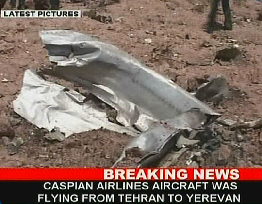 Sirous Saberi官員說,飛機在空中燃起大火后墜毀,在地上可以看見飛機的各個l零部件四處散落。