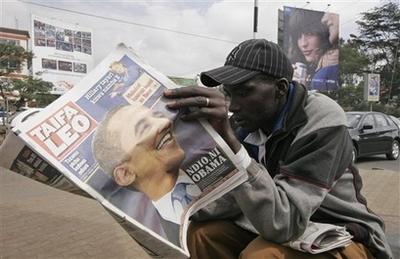 肯尼亞4日出版的報(bào)紙大幅登載有關(guān)奧巴馬的報(bào)道!犊夏醽啎r(shí)報(bào)》用整個(gè)頭版刊登了奧巴馬在白宮前的一幅照片,標(biāo)題為“奧巴馬創(chuàng)造歷史”。
