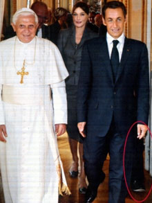 法國(guó)《巴黎競(jìng)賽畫(huà)報(bào)》日前刊登了一張法國(guó)總統(tǒng)薩科齊和第一夫人卡拉·布呂妮9月12日在巴黎愛(ài)麗舍宮接見(jiàn)羅馬教皇本篤十六世的照片,但這張照片卻讓雜志讀者們大感驚詫?zhuān)驗(yàn)槿藗儼l(fā)現(xiàn),法國(guó)總統(tǒng)薩科齊的左腿邊竟然憑空多出一條腿,可他左邊看起來(lái)并沒(méi)有站著其他人,就好像薩科齊本人長(zhǎng)出了“3條腿”一樣!