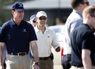 奧巴馬是在攝氏30多度的氣溫下打球的,陪同他的有美國(guó)商務(wù)部長(zhǎng)等多位高官。美國(guó)前總統(tǒng)克林頓等人都喜歡在這個(gè)空軍基地打球。