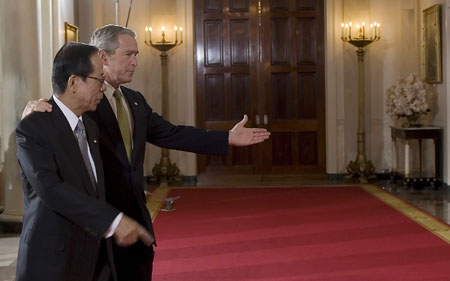 在兩個人都很為難的時候,福田明白,他這次如果再要求布什把“綁架日本人問題”與美朝關(guān)系捆綁在一起,就是大大地“不識相了”。布什也是心領(lǐng)神會,只不過面對記者,慷慨激昂地表示了一下“我們不會忘記‘綁架被害者家屬’”,而不作任何實質(zhì)性承諾。