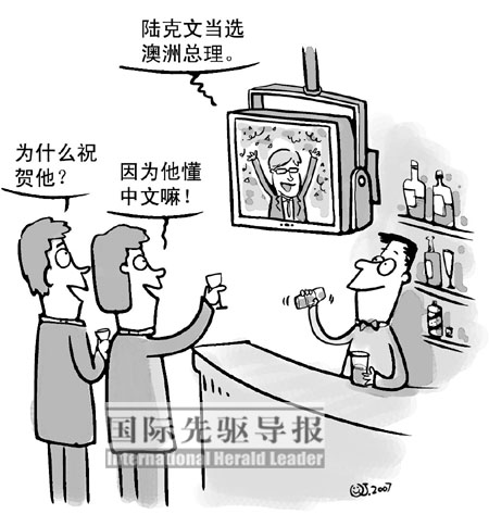 11月24日,澳大利亞聯(lián)邦大選,工黨勝出,50歲的陸克文成為澳大利亞新總理。有人說(shuō),陸克文是澳大利亞的布萊爾。這兩位政治明星都充滿活力、富有親和力、相貌俊朗,而且同為工黨領(lǐng)袖,除了陸克文能講一口流利的漢語(yǔ)之外,其他相似之極。