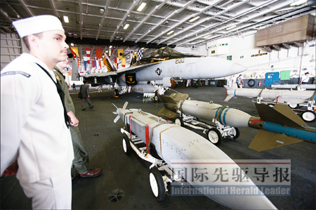 在飛行甲板上,一位名叫馬圭爾的海軍軍官向《國際先驅(qū)導(dǎo)報》記者介紹了艦上的艦載機(jī)。從EA-6B“徘徊者”電子戰(zhàn)飛機(jī)到E-2C“鷹眼”空中預(yù)警機(jī),從SH-60“海鷹”直升機(jī)到F/A-18“大黃蜂”的各種改進(jìn)型,他如數(shù)家珍。