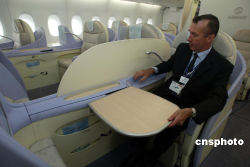 10月26日,參觀空中客車A380飛機的北京民眾被其豪華舒適的客艙所吸引。當日,一架生產編號為007的空中客車A380客機?吭诒本┦锥紘H機場N104機位,接待北京媒體及部分嘉賓的參觀。此次A380中國大陸之行為期一周,包括廣州、上海及北京三個城市,這是A380飛機2007年環(huán)球飛行之旅的重要部分。中新社發(fā) 楊影懿 攝