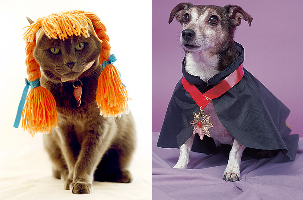 圖片二:左邊一副圖片中,一只可愛的小貓頭頂一副麻花辮假發(fā),也許它想用它來嚇唬其他動(dòng)物,可它沒想到這樣讓它看起來更可愛;在右邊一幅圖片中,一只小狗打扮成吸血鬼的模樣,威風(fēng)凜凜的可愛模樣足以嚇走別人么?(鐘巖)