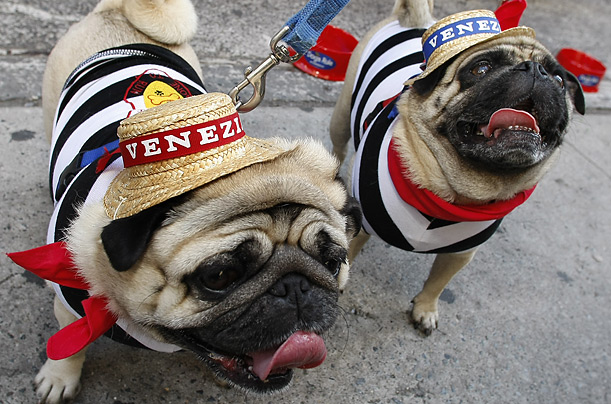 圖片七:哈巴狗馬克思和哈勃身穿橫條背心,脖系紅領(lǐng)帶,頭戴草帽,打扮成稱威尼斯鳳尾船船夫的模樣。(鐘巖)