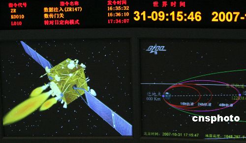 北京時(shí)間十月三十一日十七時(shí)十五分,北京航天飛行控制中心成功對(duì)“嫦娥一號(hào)”衛(wèi)星實(shí)施第三次近地點(diǎn)變軌,衛(wèi)星順利進(jìn)入地月轉(zhuǎn)移軌道,由此真正開始了她的奔月之旅!版隙鹨惶(hào)”衛(wèi)星發(fā)動(dòng)機(jī)開始工作七百八十四秒后,正常關(guān)機(jī)。北京航天飛行控制中心對(duì)各項(xiàng)測(cè)量數(shù)據(jù)的計(jì)算表明,衛(wèi)星變軌成功,由繞地飛行軌道進(jìn)入地月轉(zhuǎn)移軌道。中新社發(fā) 孫自法 攝