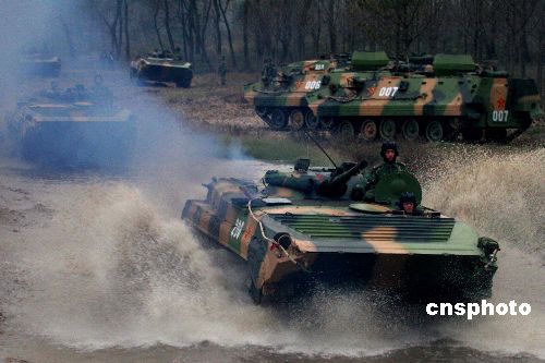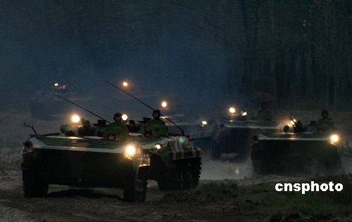 10月底,“鐵拳-2007”復(fù)雜電磁環(huán)境下機(jī)步師實(shí)兵檢驗(yàn)性演習(xí)完成電磁對(duì)抗,進(jìn)入實(shí)兵交戰(zhàn)階段。圖為裝甲部隊(duì)向演習(xí)地域集結(jié)。中新社發(fā) 曾憲平 攝