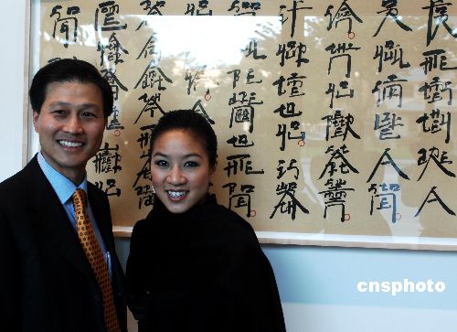 圖為關穎珊和華美銀行董事長兼總裁吳建民一起,欣賞中國當代藝術家徐冰將英文歌詞用中文正楷獨特書法表現的《巴布狄倫的脫變時節(jié)》。