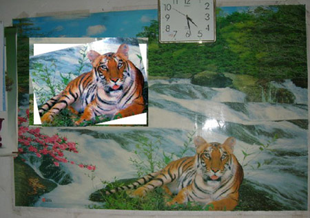 前晚9時(shí),網(wǎng)友“攀枝花xydz”在“打虎派”大本營(yíng)色影無忌華南虎臨時(shí)論壇發(fā)帖說,“周老虎”的原形是一副老虎年畫,除耳朵不一樣外,哪里都一樣,甚至連老虎紋路都是一樣。各路高手將年畫老虎與“周老虎”進(jìn)行比對(duì),得出是同一只老虎的結(jié)論。
