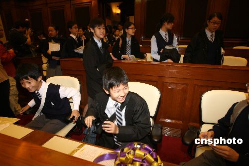 圖為同學(xué)們?cè)谧h員的座位上體驗(yàn)當(dāng)議員的感覺(jué)。