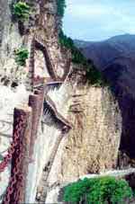 通天云衢:鐵索嶺上古建筑星羅棋布,山嶺巍峨,曠谷老松。綿綿黛色賞心悅目,但是從古至今鐵索嶺上下只有通過鐵索,很多老弱者不能成行,游人只能抱憾而去。為彌補(bǔ)此不足,三佳綿山投資開發(fā)者閻吉英先生于此山壁上建“之”字形天梯一座。天梯依山懸空縱橫盤亙而成,共計440多個臺階,全長300余米,如龍駕祥云,氣勢雄偉,堪稱精品。春日登此棧道,觀谷中山花競放,鶯轉(zhuǎn)鸝鳴,微風(fēng)拂過發(fā)鬢,寵辱皆忘,心曠神怡。夏日登此棧道,看對山松柏蒼翠,山巒如黛,常有彩虹從溝間騰起,雖有游人不同心情千種萬種,看此景,只會感到聳峰茂林充盈神心。秋日的綿綿薄霧如白絮飄飛,云隨風(fēng)飄,風(fēng)隨云轉(zhuǎn),姹紫嫣紅的山嶺,時顯時沒。冬日雪落棧道云衢,蒼蒼茫茫,山接天,天連山,“大雪壓青松,青松挺且直,”只覺若谷虛懷之外的自己頂天立地。雪霽,金光灑滿山嶺,湛藍(lán)的天,一覽無余,畫中的您,只能用詩來喻。無論何時行于此棧道上,塵勞頓無,飄然欲仙。