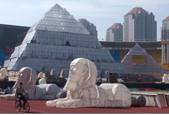 一座高達四十七米的金字塔模型曾出現在北京工人體育場。這里正在搭建世界超大型景觀歌劇《阿依達》的舞臺。該舞臺面積達六千多平方米。作為北京國際戲劇演出季的重頭劇目,《阿依達》上演。以后這種活動可能要繳費。中新社發(fā) 張煒 攝