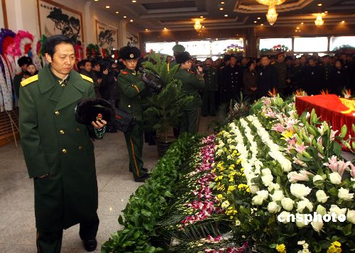 公安部消防局副局長李世雄在烏魯木齊市殯儀館送別三位烈士。