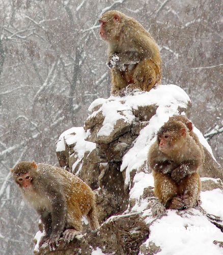 1月19日,淮北大雪。安徽淮北動物園猴山上的猴們,或鉆進山洞、或在山上跳躍。中新社發(fā) 孟德強 攝
