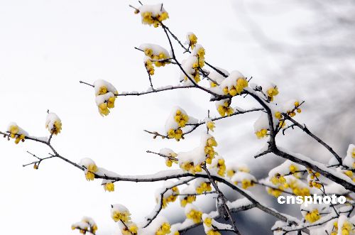 1月19日,安徽淮北相山公園內(nèi)數(shù)株盛開的臘梅,在冰雪映襯下十分嬌艷。中新社發(fā) 泰峰 攝